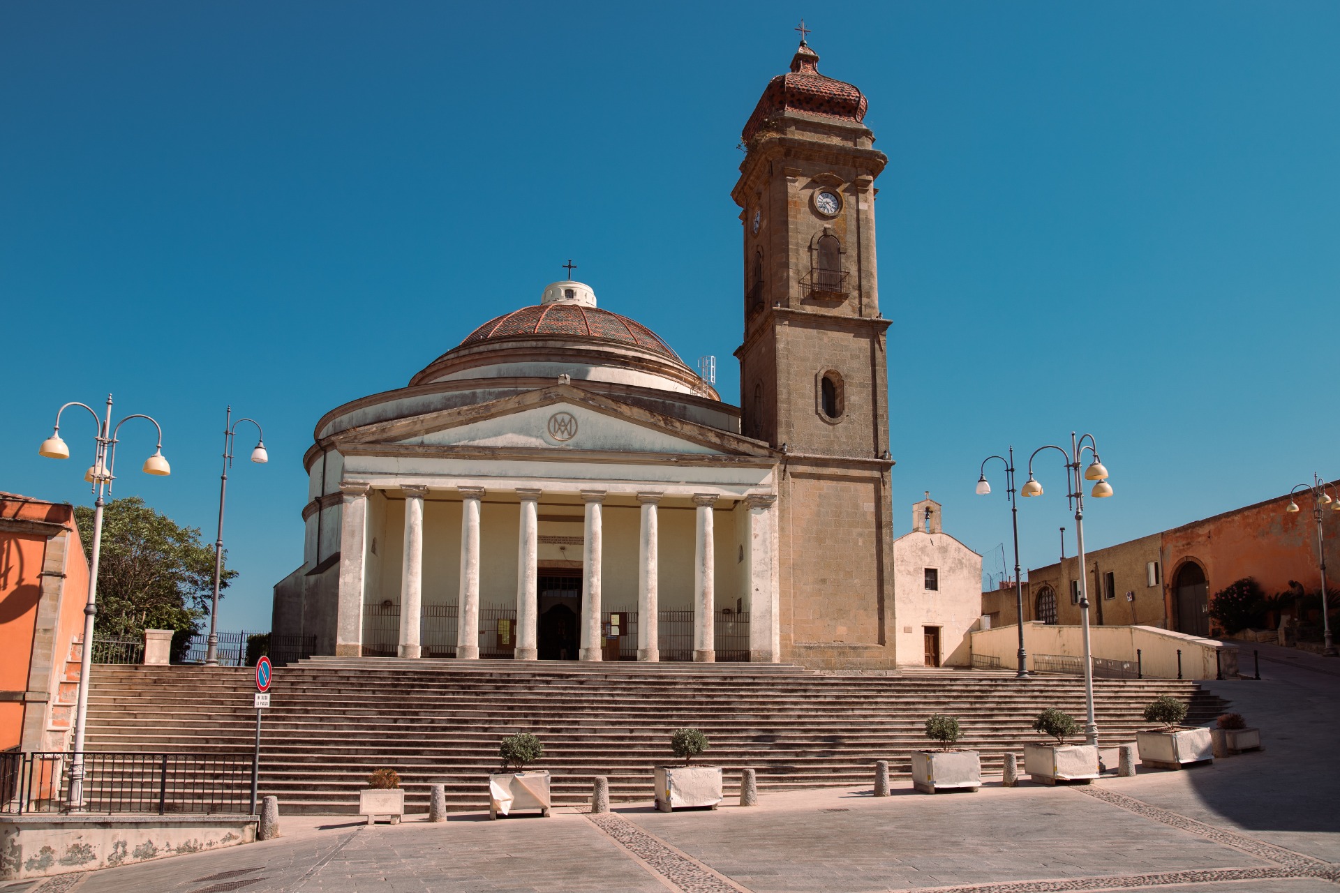 A fianco dell’edificio neoclassico si erge la torre campanaria gotico-catalana, testimonianza di una chiesa preesistente del XVI secolo (prima metà del Cinquecento).